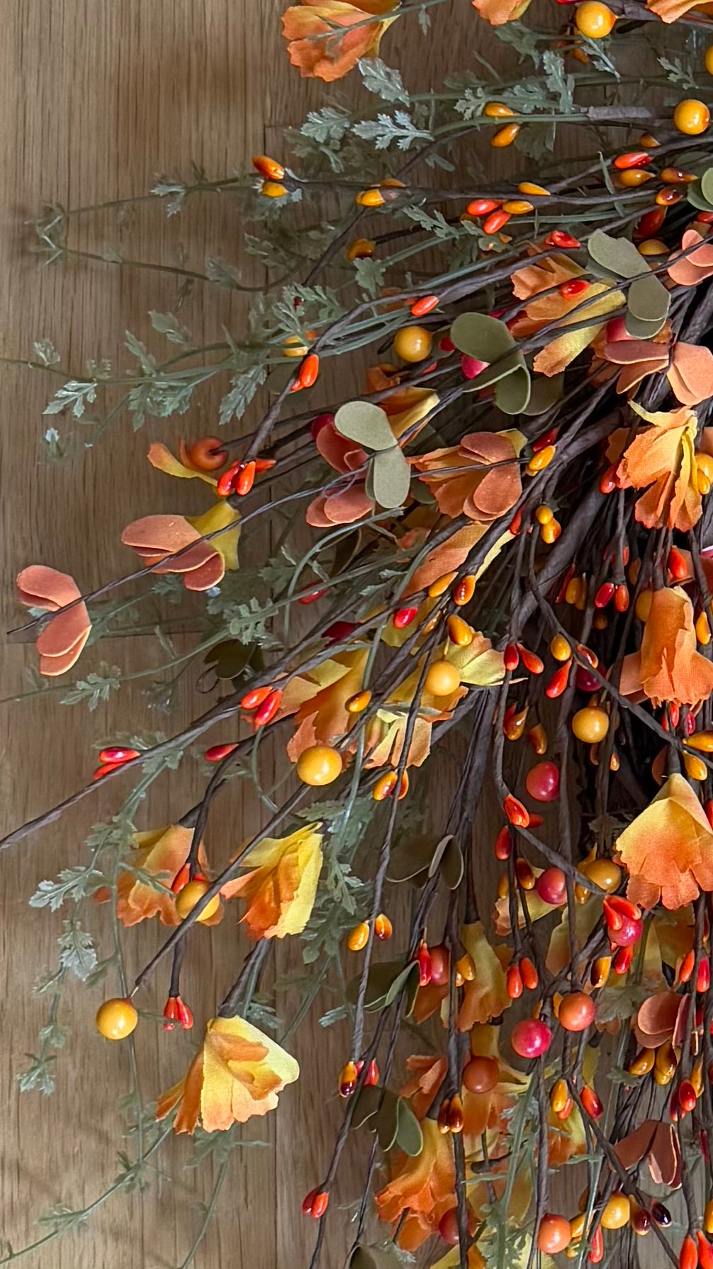 This wreath's elegant design features flowy fall leaves in rich, warm tones and is beautifully accented with abundant stems of seasonal berries ringing the wreath with texture and color. Whether hung on your front door, above a mantel, or in an entryway, it brings a graceful, nature-inspired touch to your fall décor.