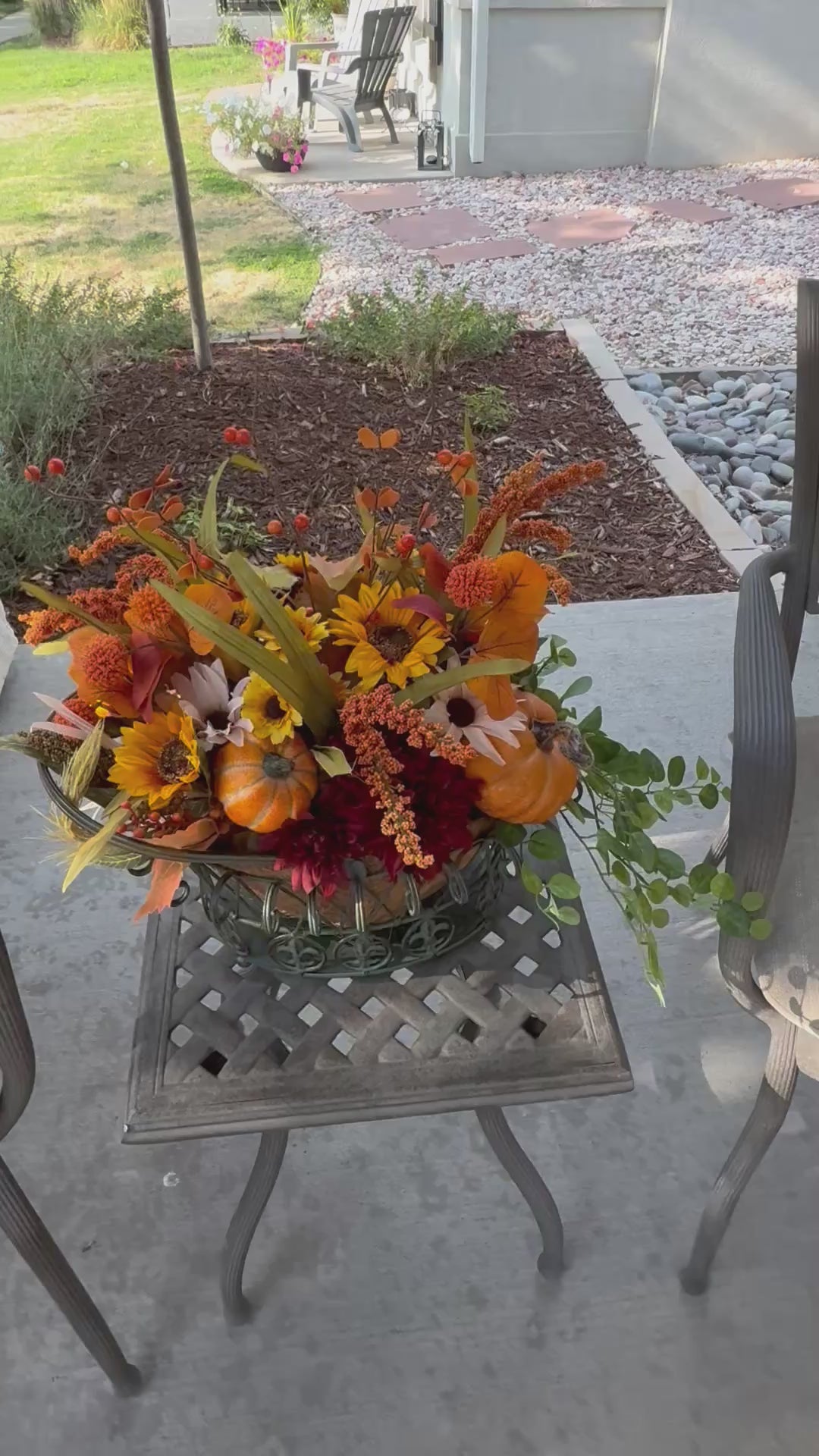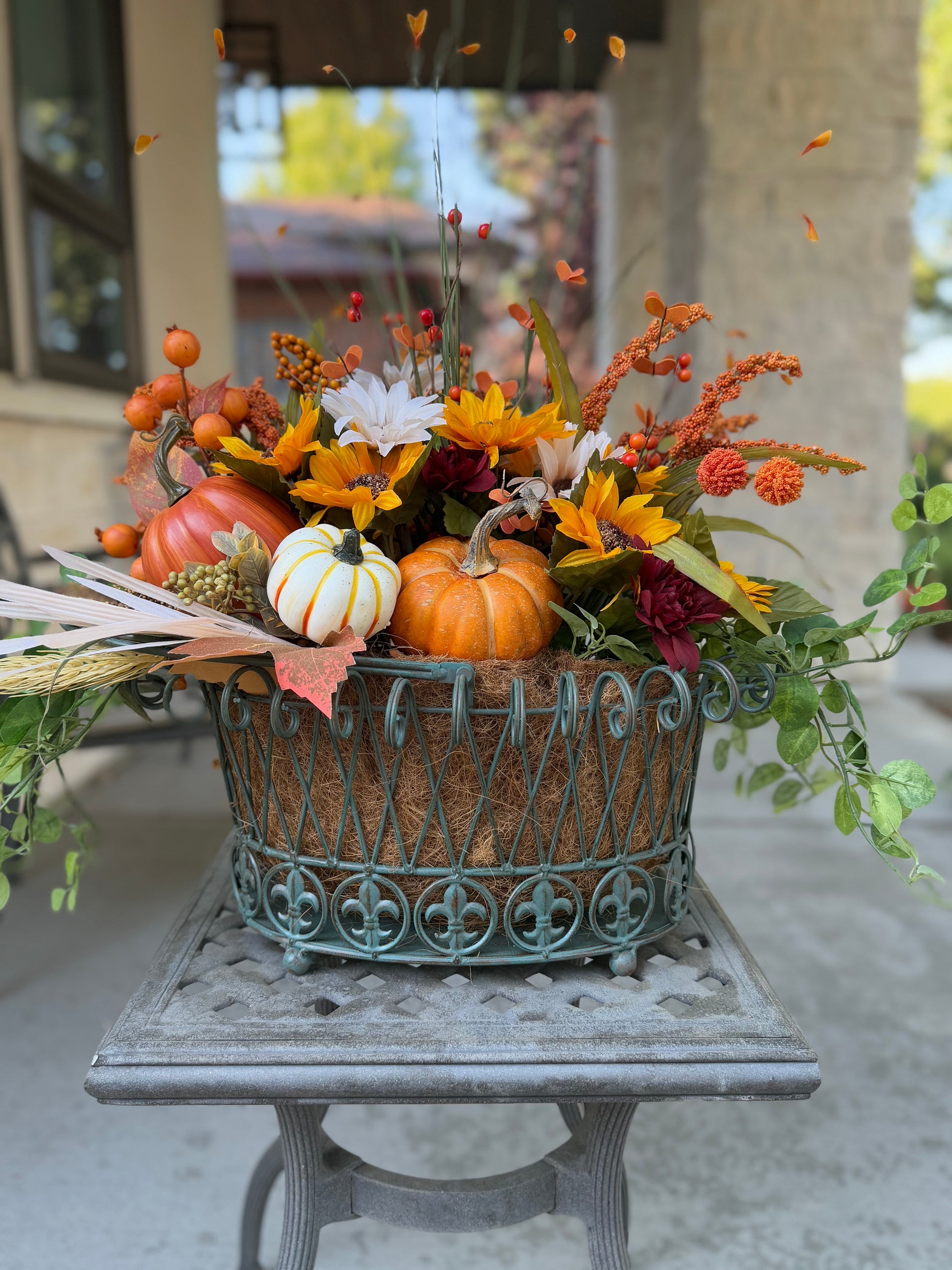 Add a touch of elegance to your autumn décor with our stylish large metal garden basket, overflowing with gorgeous fall flowers and lush greenery. Designed to capture the rich textures and warm tones of autumn, this arrangement brings instant charm to porches, patios, or garden tables. Whether used as a welcoming accent or a centerpiece, it’s a beautiful way to celebrate the season’s natural beauty.