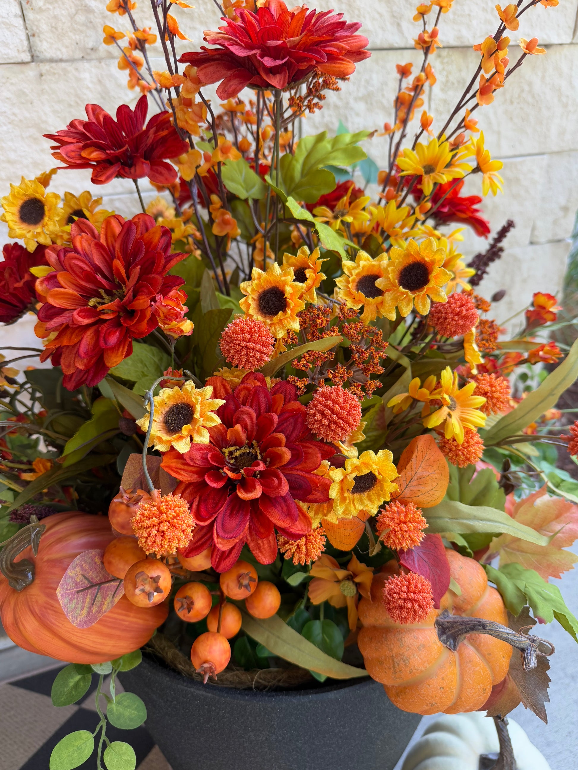 Bring the rich colors of autumn to your entryway with this vibrant drop-in planter. Overflowing with lush faux botanicals in rich autumn tones, this statement piece adds instant charm to your porch, patio, or front door. Thoughtfully designed with a mix of seasonal foliage and textures, it's the perfect way to celebrate fall and greet guests with a festive, inviting touch.